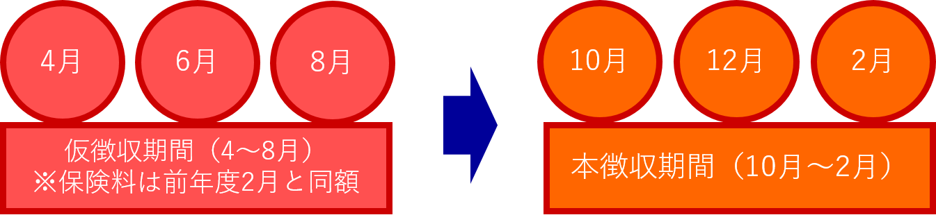 65歳以上の人の介護保険料は市民税の課税状況が確定する6月以降に決まる都合上、4~8月は確定額での徴収ができず、暫定額での徴収となります。この期間は仮徴収期間となり、前年度2月の天引き額と同額が当てはめられます。10月~2月は本徴収期間となり、6月に確定した年間保険料額から4~8月に収めた保険料を差し引いた額を10月~2月の3回に分けて徴収します。