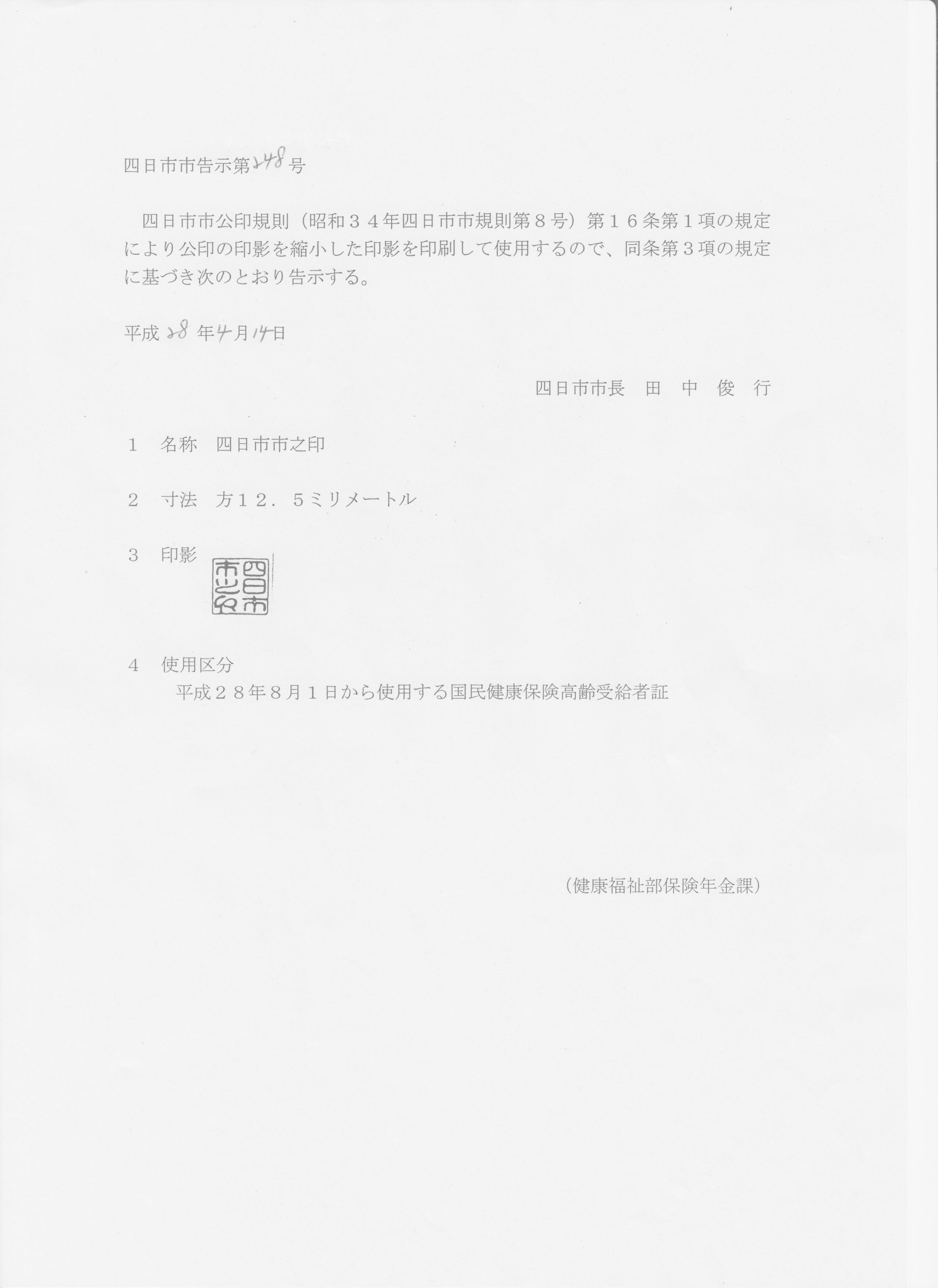 | 2016年04月14日 | 平成28年四日市市告示第248号 | 公印の印影の使用 | 保険年金課 |