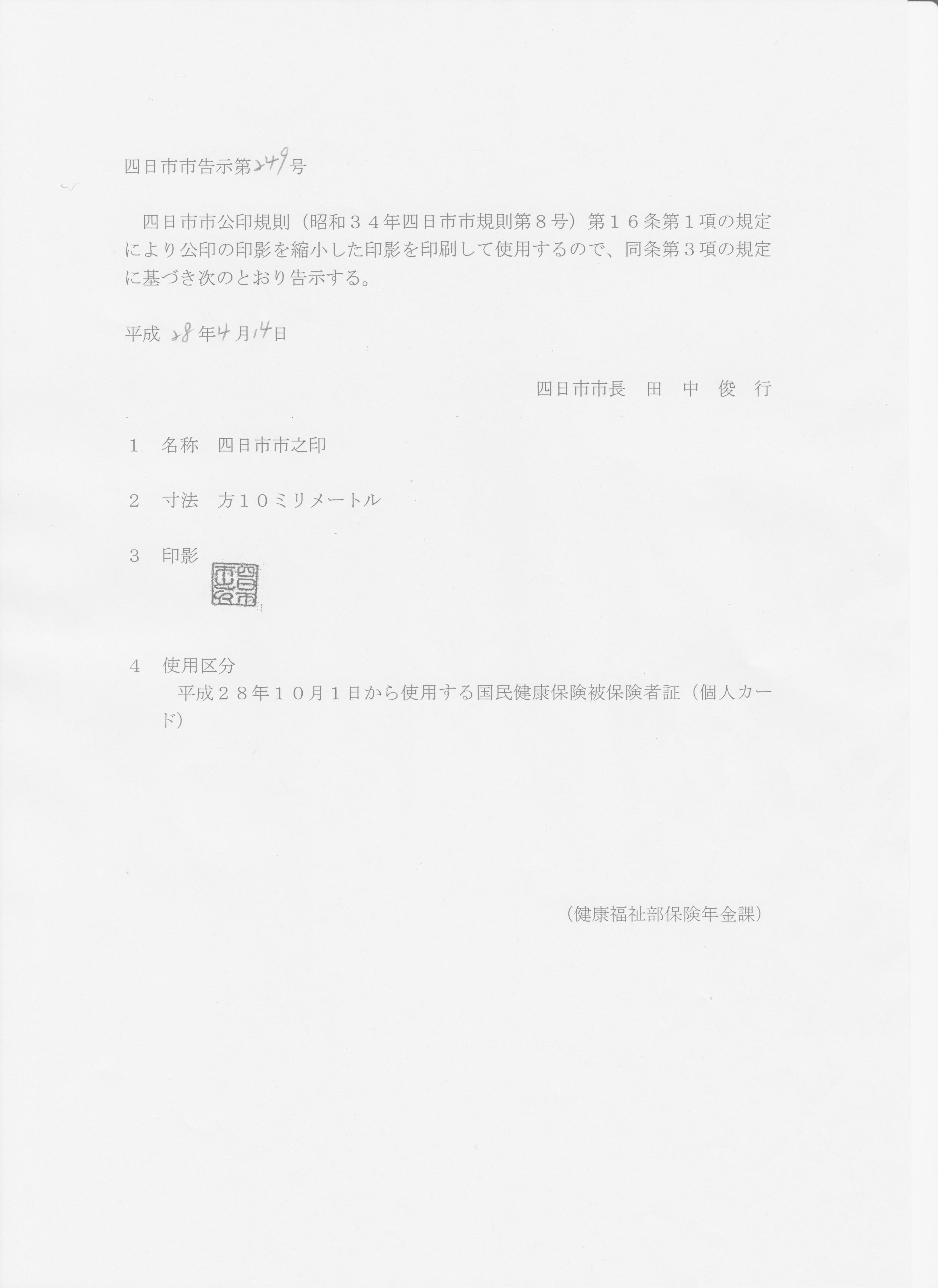 | 2016年04月14日 | 平成28年四日市市告示第249号 | 公印の印影の使用 | 保険年金課 |