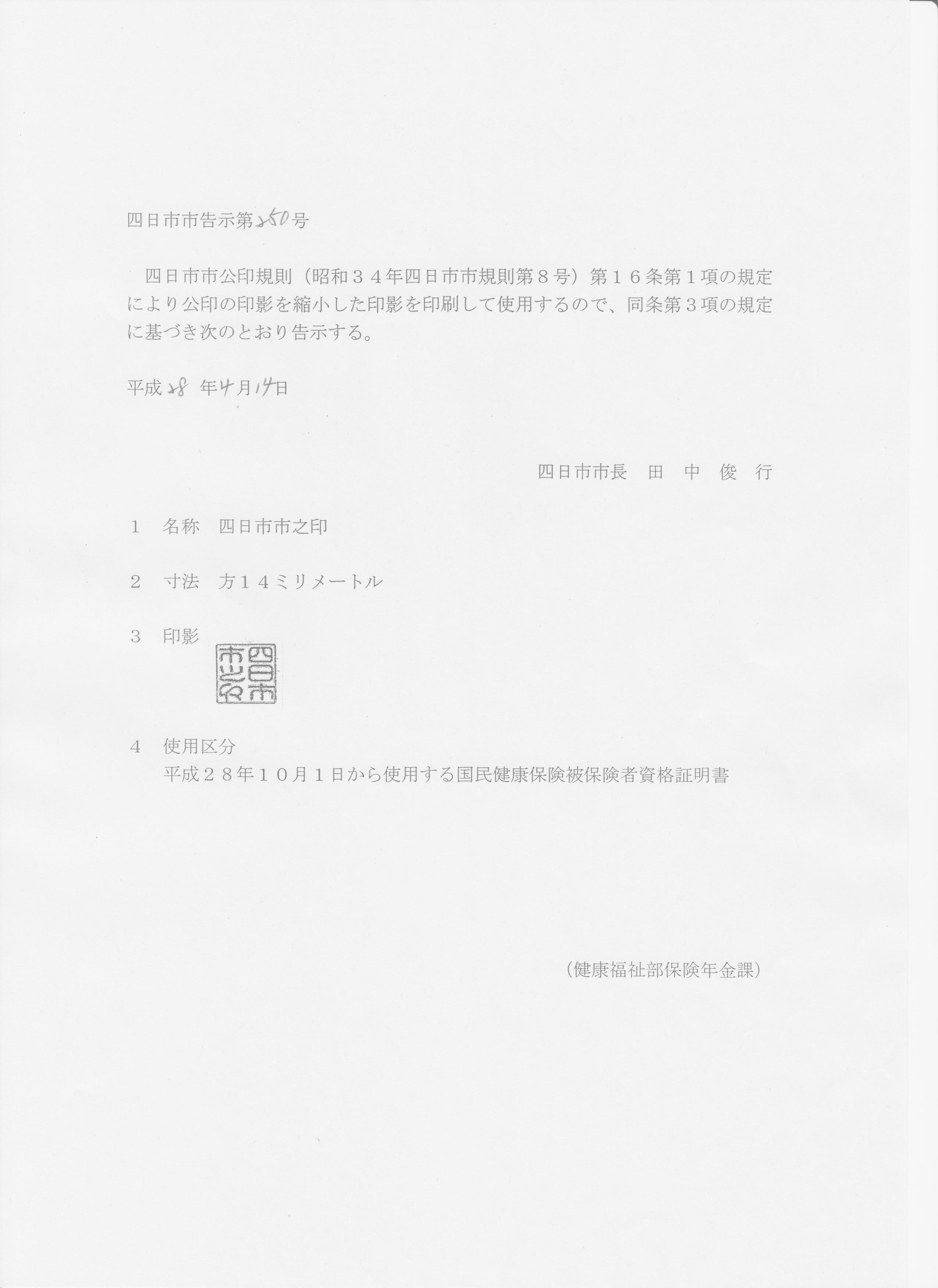 | 2016年04月14日 | 平成28年四日市市告示第250号 | 公印の印影の使用 | 保険年金課 |