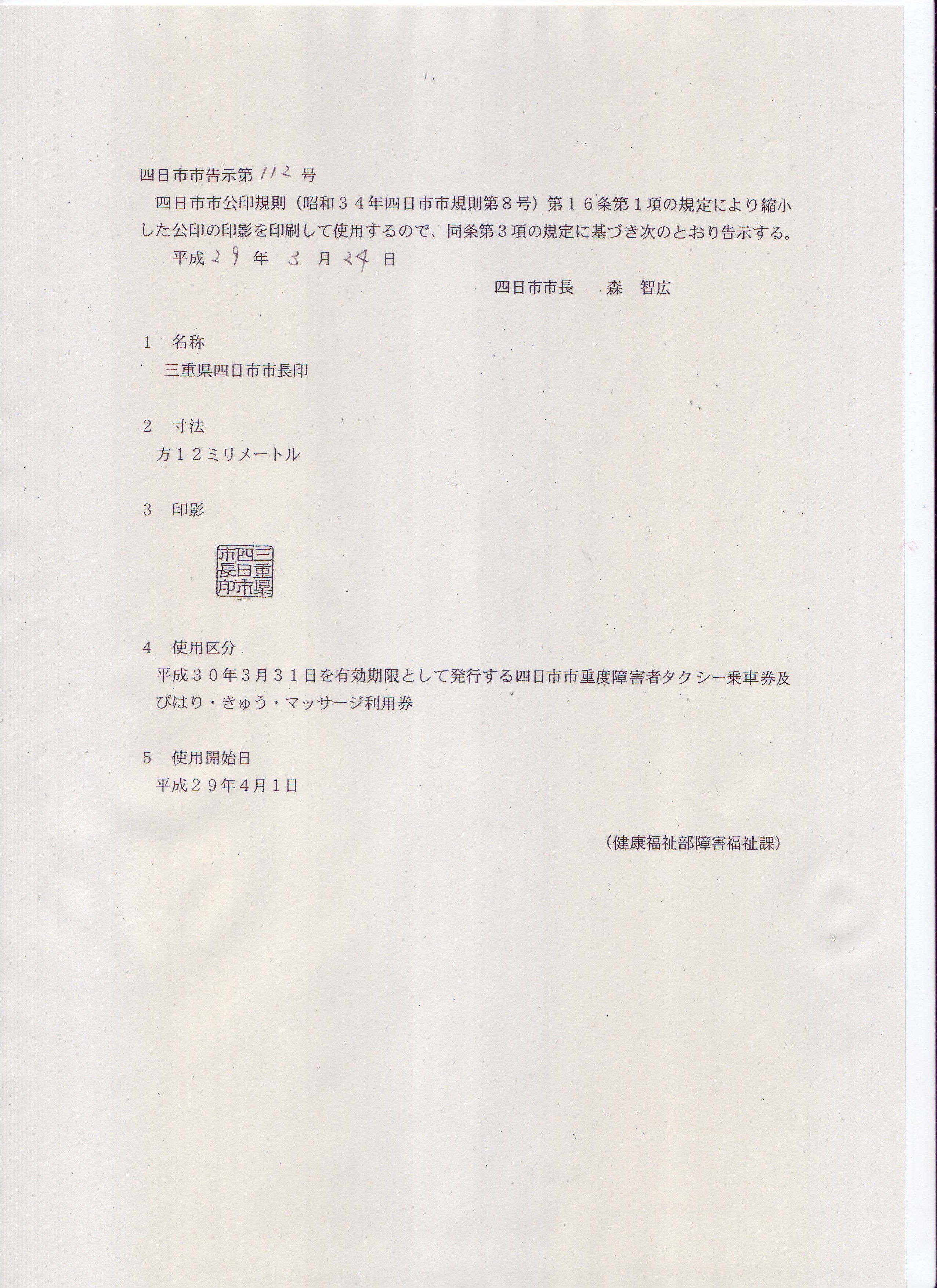 | 2017年03月24日 | 平成29年四日市市告示第112号 | 公印の印影の使用 | 障害福祉課 |