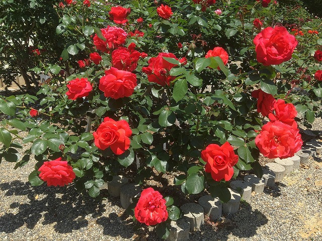 春季と秋季の年2回開花する四季咲きのバラであり、1区画で8~10株程度のバラを