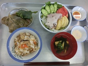 メニュー:とり飯、いばら餅、みょうが餅、若竹汁、夏野菜と豚肉のサラダ