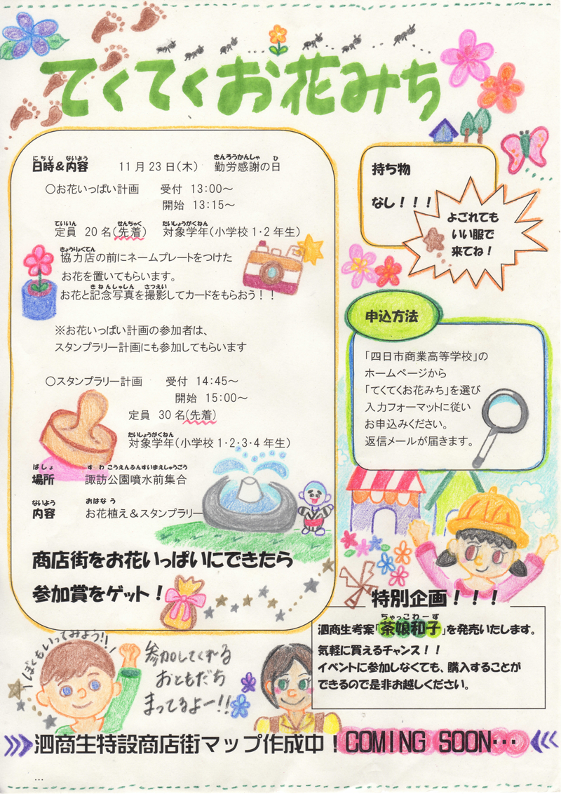四日市商業高等学校の課題研究「シティマネジメント講座」を受講の生徒が、商店街に若い世代や新しい層を呼び込むために企画した小学生参加型の花植え活動とスタンプラリーイベント等を開催します。当日は、四日市商業高等学校と地元の菓子店とのコラボ商品「茶娘和子(ちゃっこわーず)」等の販売会も開催します。