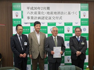 平成30年3月8日(木)四日市市役所にて、六次産業化・地産地消法に基づく事業計画の認定証交付式が行われました。