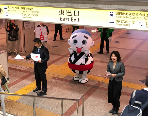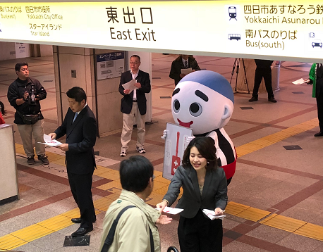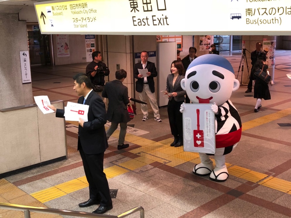 ヘルプマークの配布開始にあわせて、ヘルプマークの啓発と普及を図るため、三重県のヘルプマーク・アンバサダーの小﨑麻莉絵さんと一緒に近鉄四日市駅前シャンデリア広場において街頭啓発を行いました。