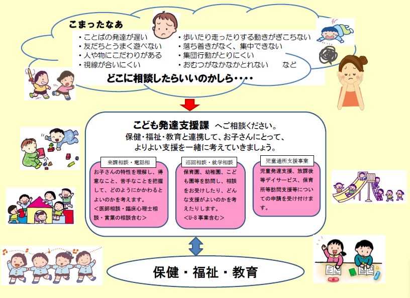 こどもの発達について、ともに考え、必要に応じて関係機関等と連携を図りながら、支援をしていきます。相談についての秘密は厳守されます。お気軽にご相談ください。