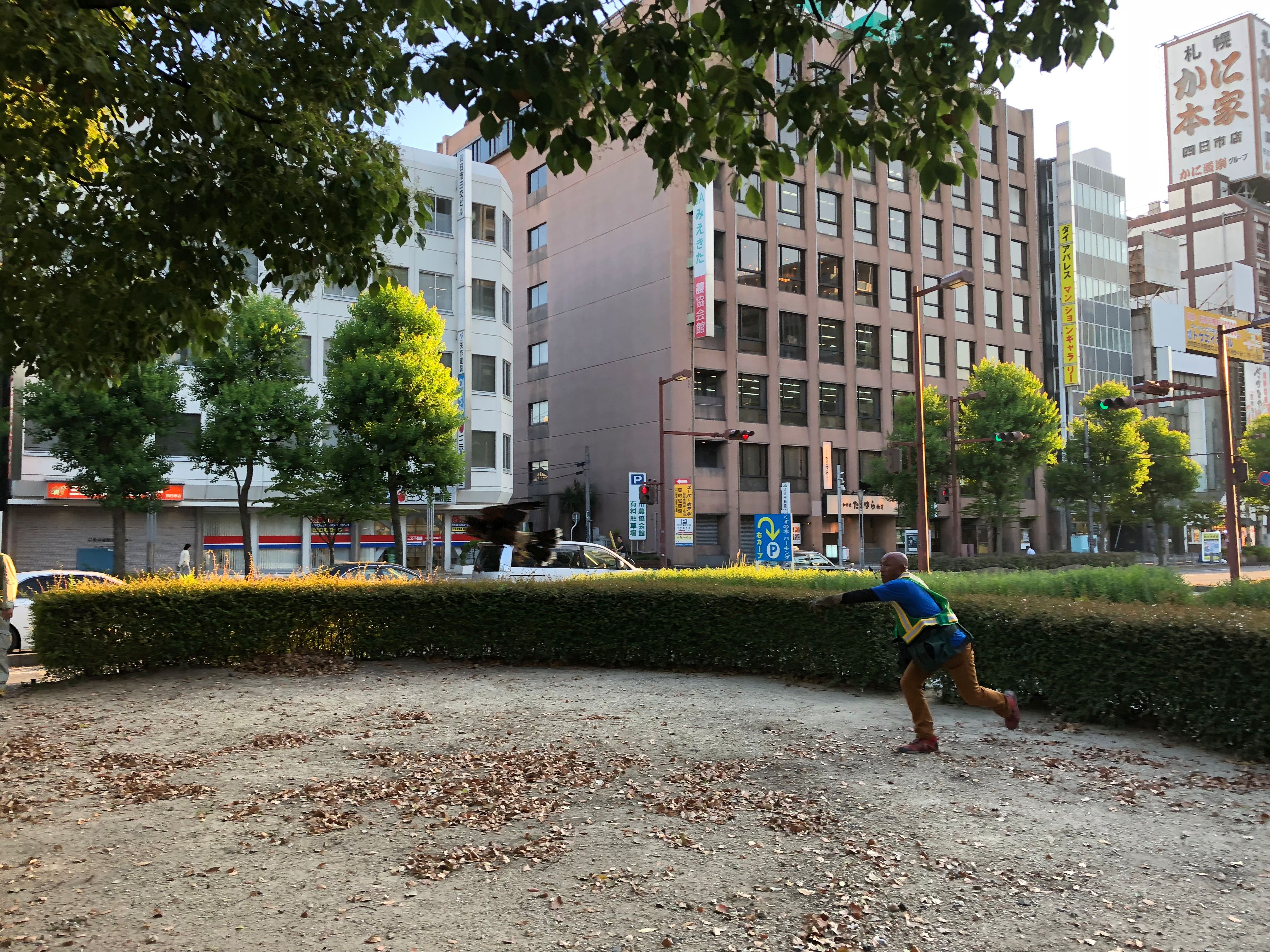 鷹匠2名、鷹2羽により、国道1号から近鉄四日市駅に移動しながら、放鷹を実施。