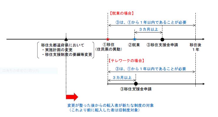 (2)制度変更における時期的要件として、移住支援制度の要綱等の変更が整った後に移住・就業した者から変更後の要件が適用できます。(令和7年4月1日改正の要綱の要件に当てはまる場合は令和7年4月1日以降に転入している必要があります。)
