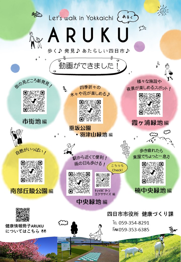 市では、「楽しく歩いて健康づくり」を目指し、健康情報冊子「ARUKU」「ARUKU vol.2」「ARUKU vol.3」の動画版を作成しました。