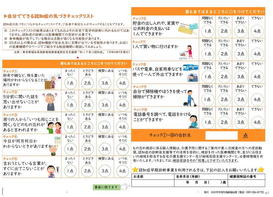 かつ、「認知症早期診断事業(もの忘れ検診)のご案内」4~5ページに掲載の「自分でできる認知症の気づきチェックリスト」にて合計点が20点以上だった人