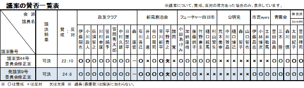 | 発議第9号 | 帯状疱疹ワクチンへの助成並びに定期接種化を求める意見書の提出について | 修正可決 | 賛成多数 |