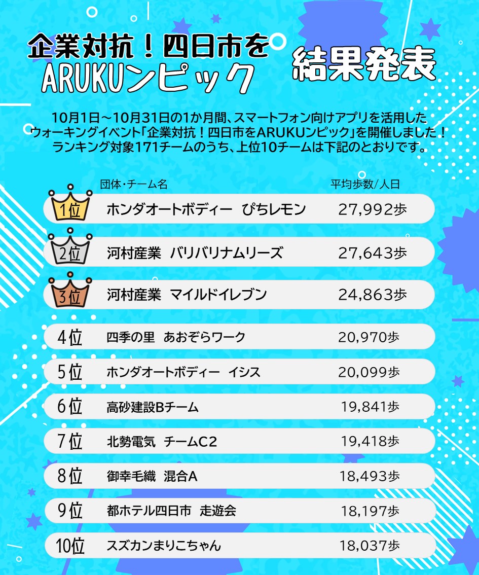 「企業対抗!四日市をARUKUンピック」へご参加いただいたことで、普段から運動される人もされない人も健康づくりに取り組んでいただけたと思います。継続することはなかなか難しいことではありますが、1か月取り組めたことを自信に、これからも望ましい生活習慣を続け、元気でお過ごしください。