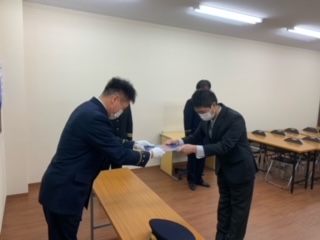令和5年2月6日(月)四日市市消防団協力事業所表示証の交付式をカネニ総業株式会社伊勢湾マリーナと株式会社ENEOSマテリアル四日市工場で執り行いました。