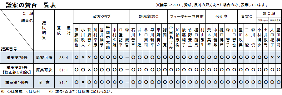 | 修正案等 | 議案名 | 議決結果 | |