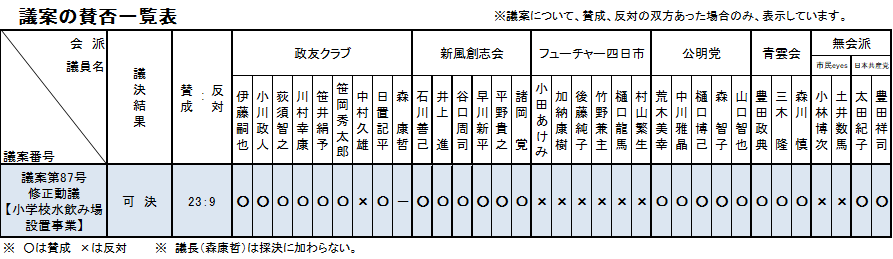 | 議案第87号 | 令和5年度水道事業会計予算 | 修正可決 | 賛成多数 |