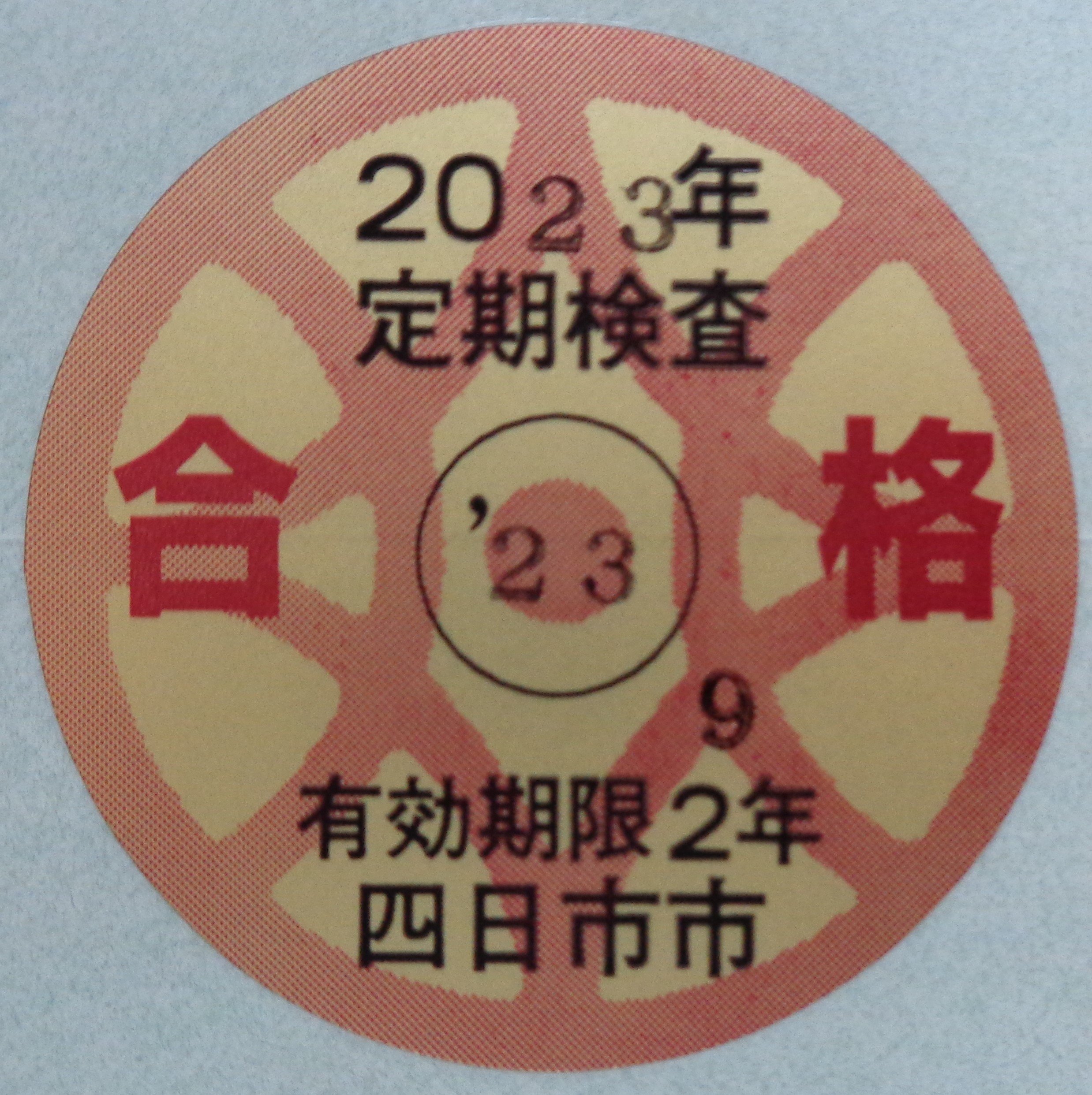 上の定期検査済証印(定期検査合格シール)は2023年9月の定期検査に合格したことを表します。