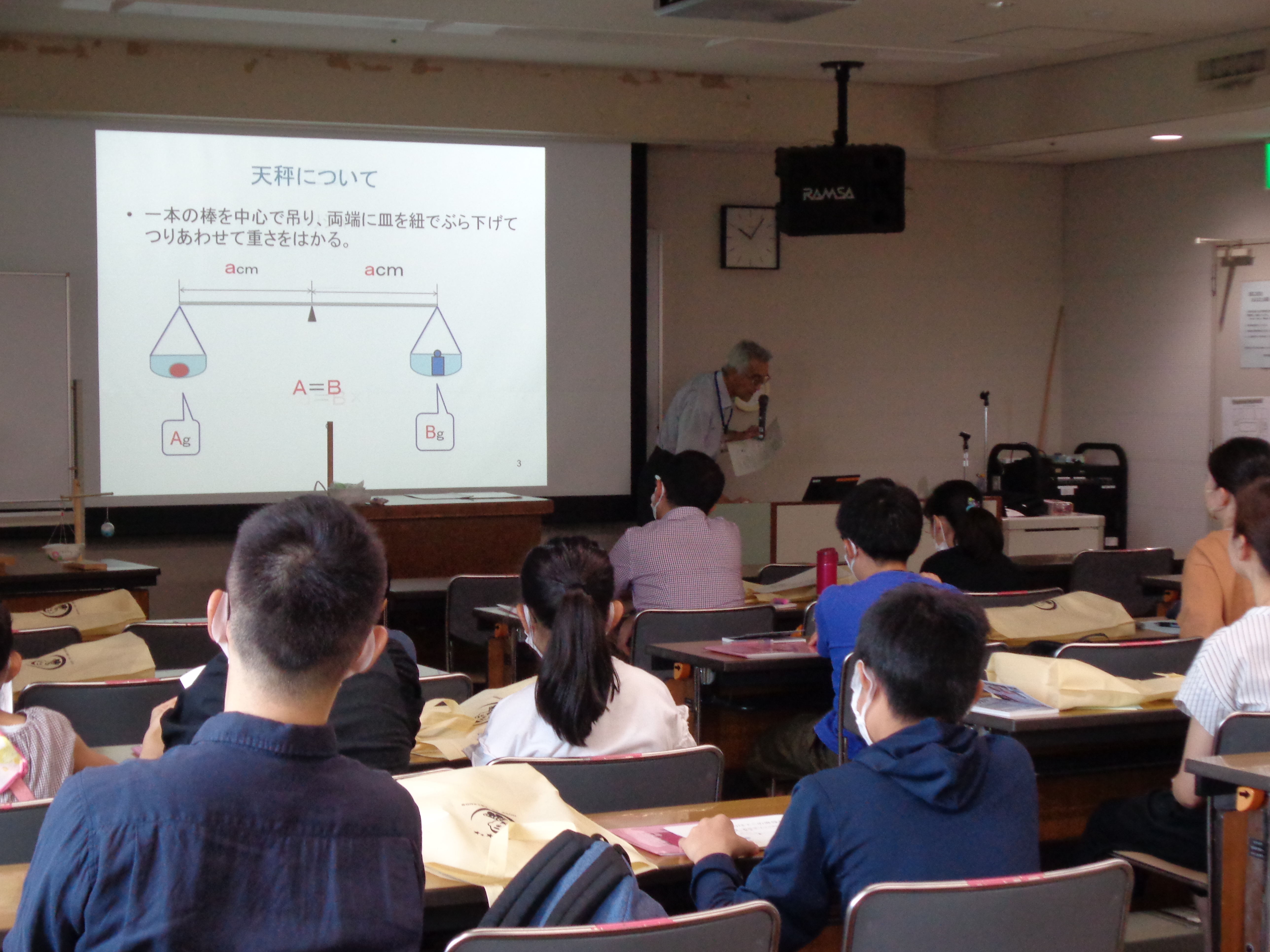 令和5年8月19日(土)に夏のこども教室(計量講座)を開催し、21組の方々にご参加いただきました。当日ははかりの歴史についてのお話を聞き、棒はかりを作って実際に身近なものの重さをはかりました。