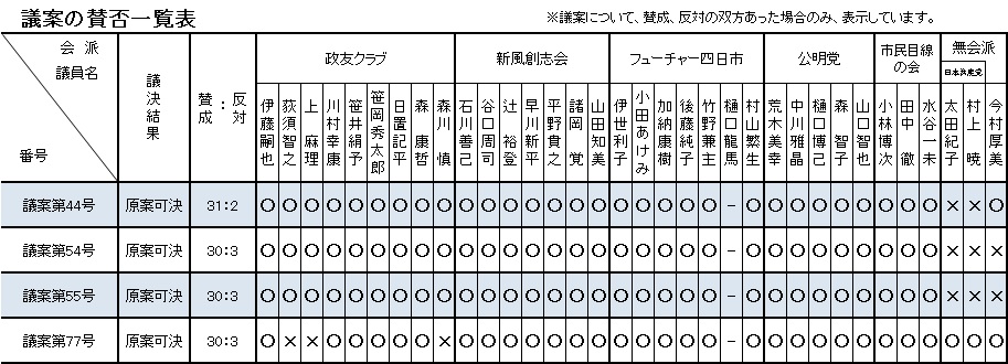 | 議案第77号 | 工事請負契約の締結について―近鉄四日市駅周辺(四日市中央線)整備工事(その5)― | 原案可決 | 賛成多数 |