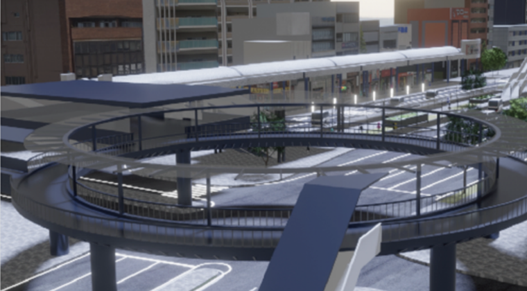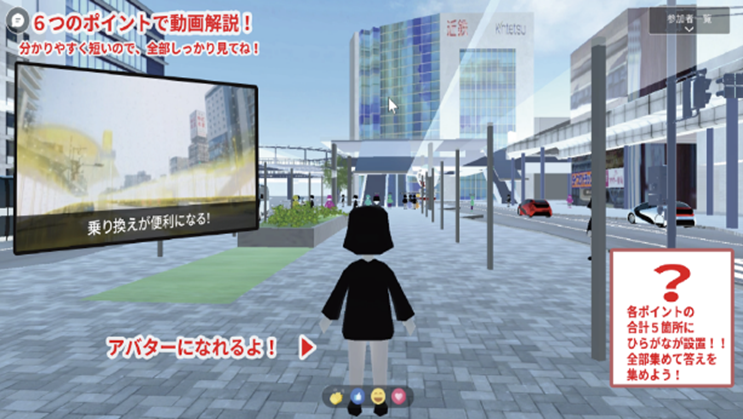 (株)FIXERのメタバースYOKKAICHIにおいて、中央通りの完成イメージの動画を各箇所に配置し、アバターで未来の四日市をまち歩き体験いただくことで、四日市市中央通りの未来の姿について知っていただけます。