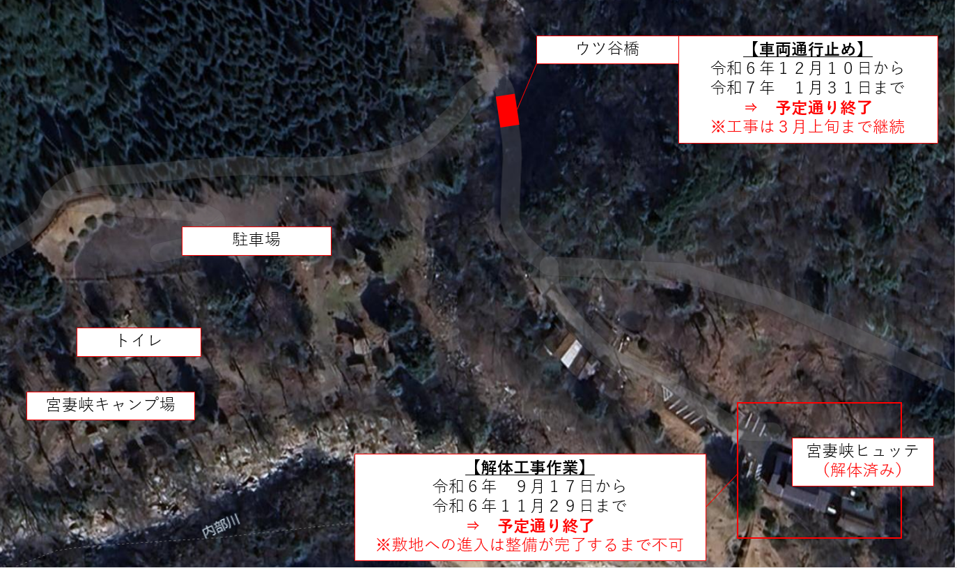 宮妻峡ヒュッテの解体工事並びにウツ谷橋修繕工事に伴う車両通行止めについて、次のとおりお知らせいたします。