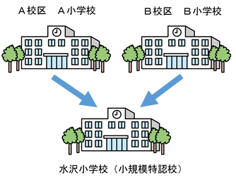 本市の学校規模等適正化計画において、小学校は、行政区との整合性の要請が高いため、小規模校であっても、一つの行政区には最低一つの小学校を存続させることが望ましいと考えており、小規模校ではとくにその強みを活かしつつ課題の緩和につながる方策を講じ、教育環境の充実を図っています。その方策のひとつとして、児童数の推計が著しく減少傾向にある水沢小学校において、小規模特認校制度を令和7年度から適用します。