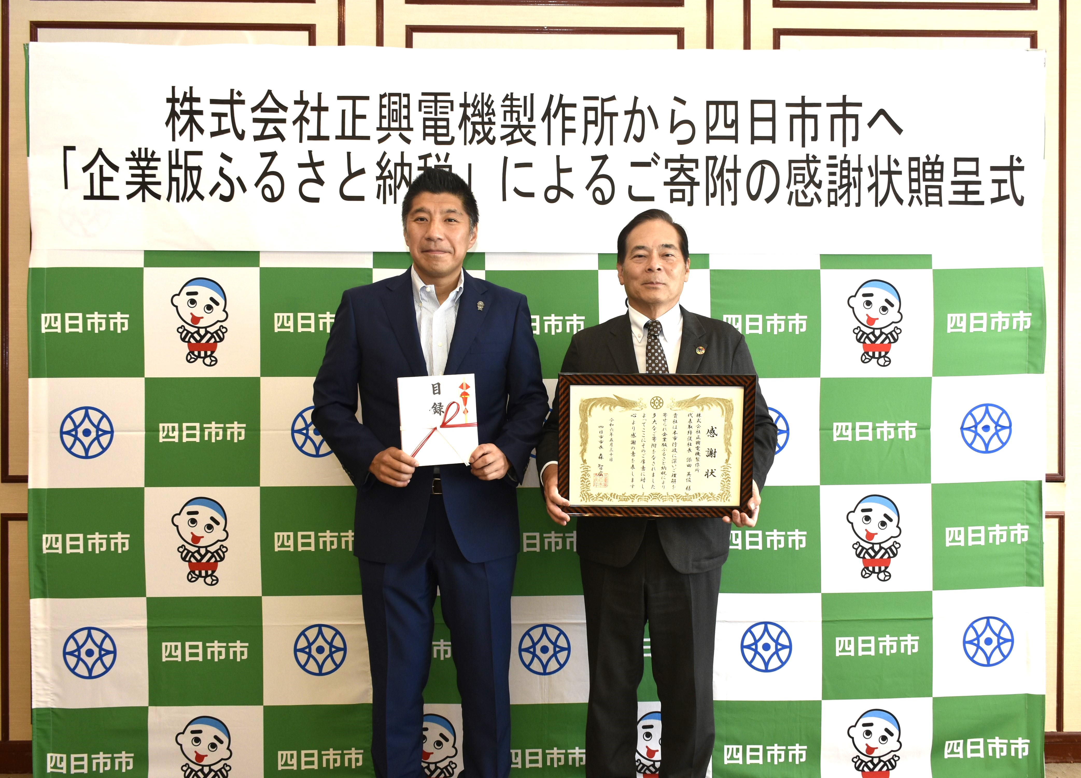 令和6年5月30日(木)には、代表取締役社長である添田 英俊様が四日市市役所をご訪問され、寄附金の目録を森市長に贈呈されました。また、森市長からは感謝状の贈呈を行いました。