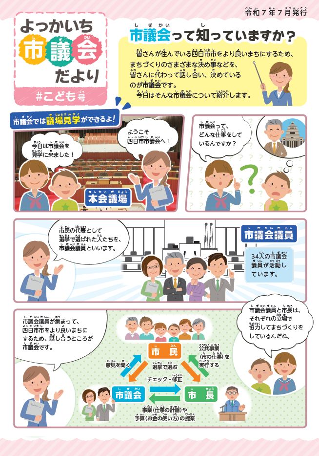 市議会では、未来を担う子どもたちに政治や市議会に関心を持ってもらえるよう、市議会の仕組み等を分かりやすく紹介する「よっかいち市議会だより#こども号」を発行しています。