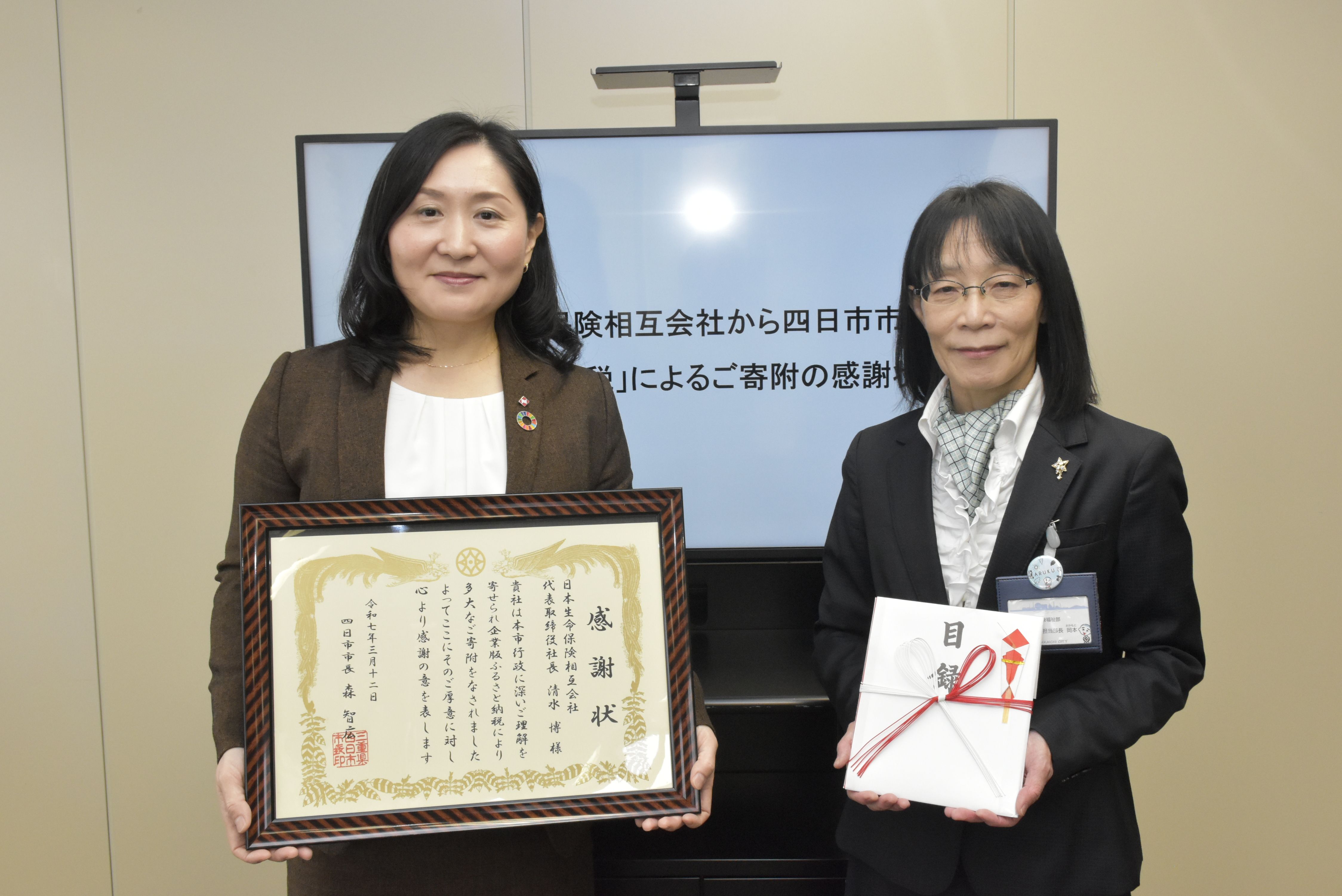 令和7年3月12日(水)には、四日市支社 支社長 前畑 景子 様が四日市市役所をご訪問され、市健康福祉部 岡本部長に寄附金の目録をお渡しいただき、また、岡本部長からは感謝状の贈呈を行いました。