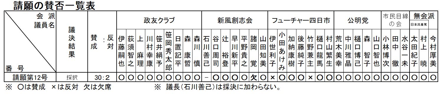 | 請願第12号 | 小中学校給食の無償化を求めることについて | 採択 | 賛成多数 |
