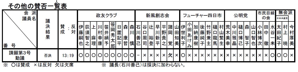 | 請願第3号 動議 | PFAS曝露によるリスクを軽減して市民の健康を守るために市全域のPFAS汚染の実態把握を早急に行うよう求めることについての審査を本日中に行うことを求めることについて | 否決 | 賛成少数 |