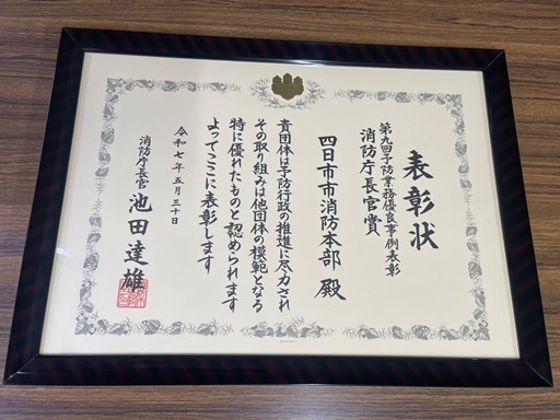 総務省消防庁が主催する第9回予防業務優良事例表彰において、四日市市消防本部の事例が、特に他団体の模範となる優れたものであると評価され、3年連続、4度目となる消防庁長官賞を受賞しました。