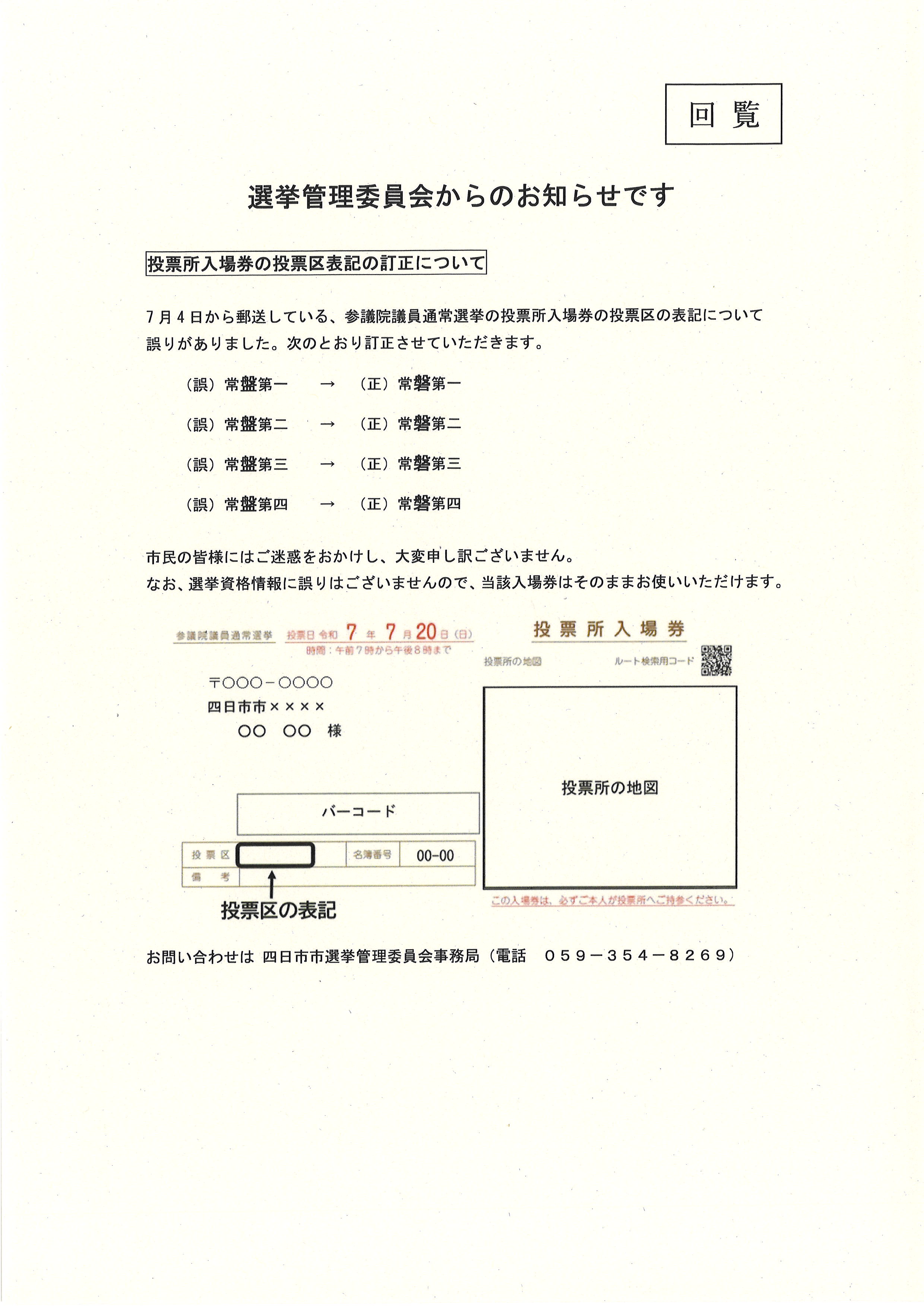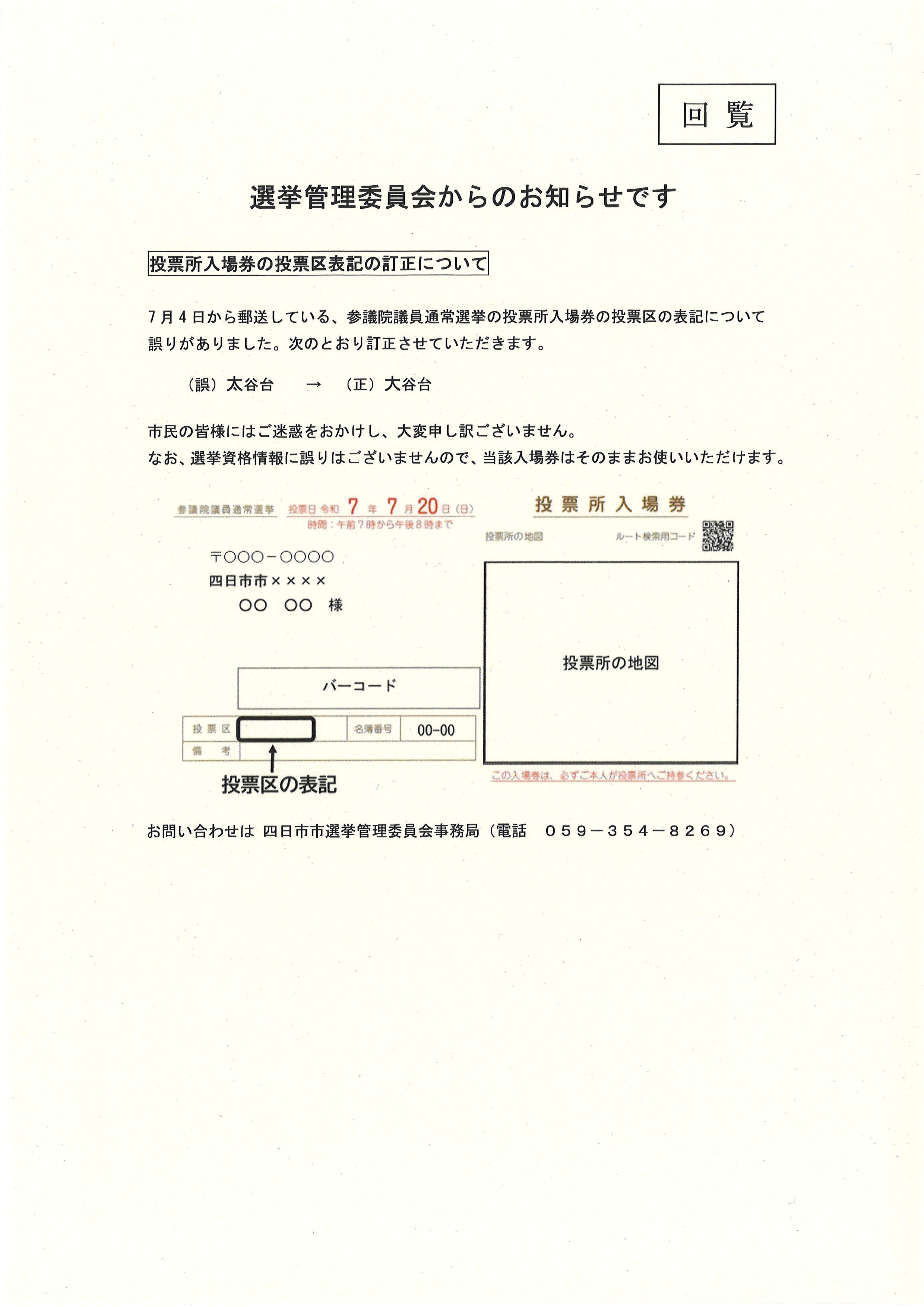 - 【三重、大矢知、海蔵地区】(組回覧)「参議院選挙投票区訂正案内」(PDF/93KB)