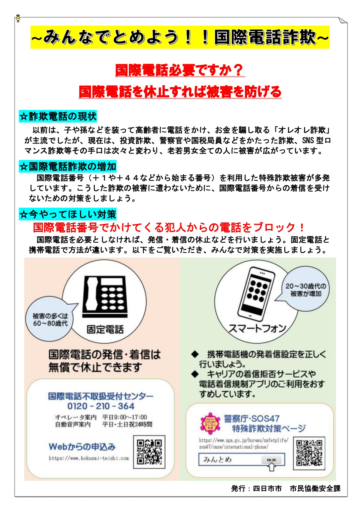 トップ > 市民の方へ > 安心安全 > 防犯 >みんなでとめよう!!国際電話詐欺
