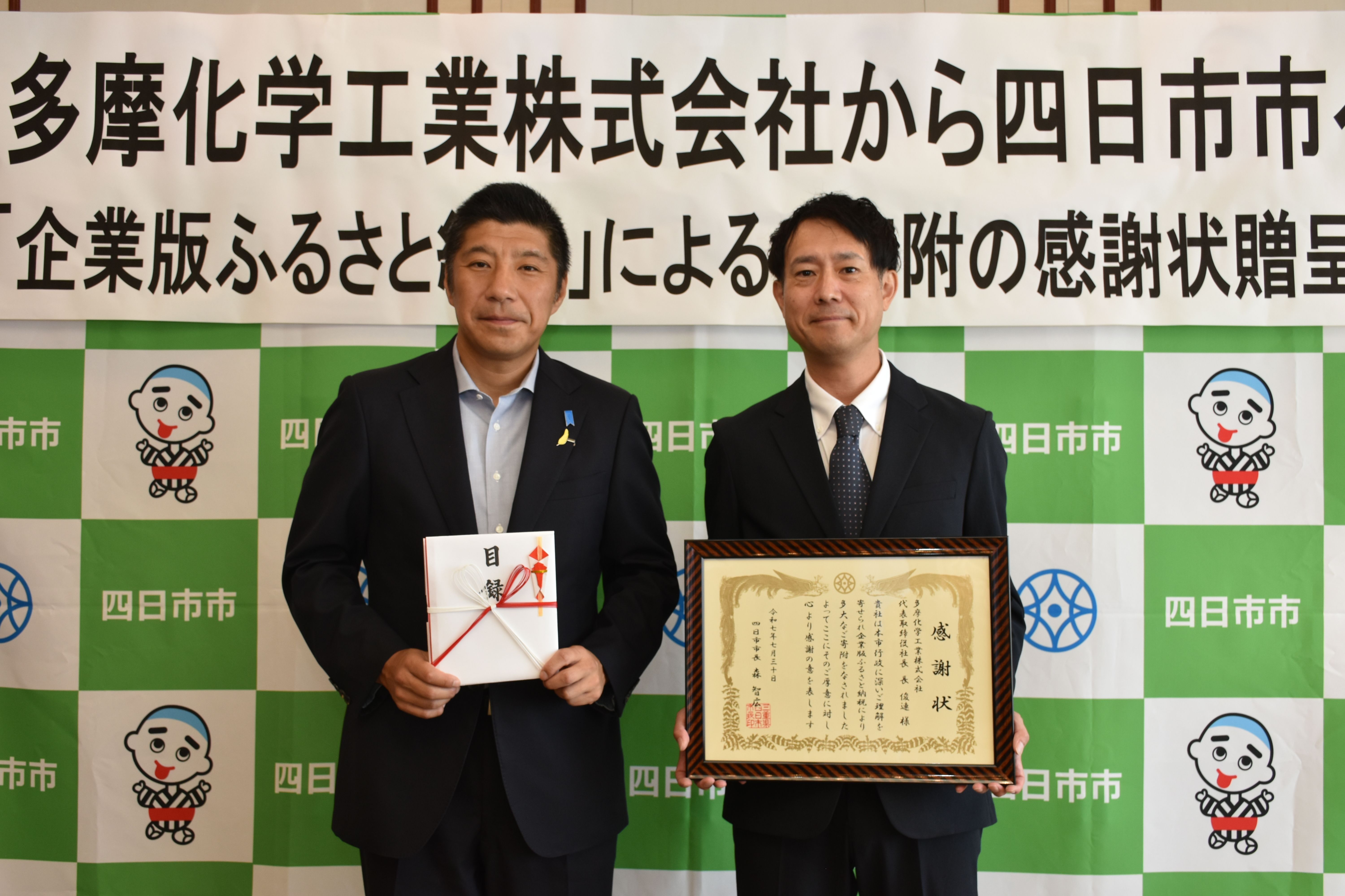 (右から、多摩化学工業株式会社四日市工場長 伊藤 健太郎様、森市長)