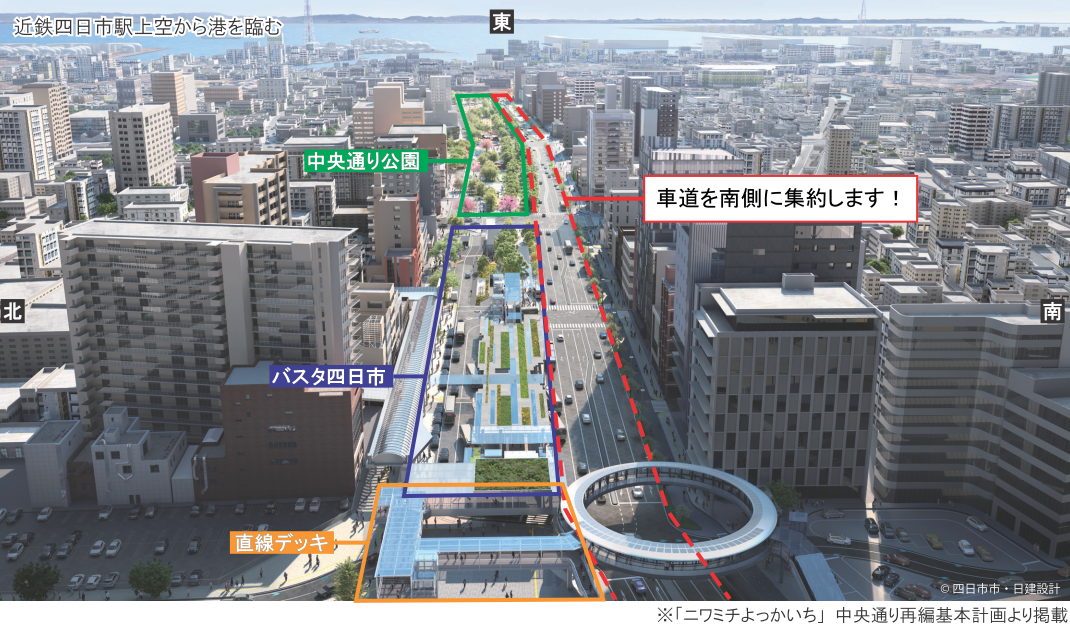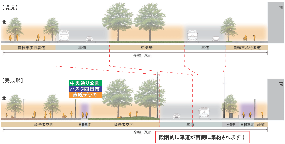 本市では中央通りの再編を進めており、近鉄四日市駅からJR四日市駅の道路空間では、下に示すように車道を南側に集約し、北側には直線デッキや中央通り公園、国が行うバスタ四日市を整備していきます。