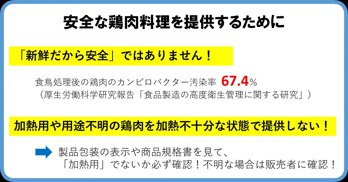 *食肉を十分に加熱調理(中心部を75℃以上で1分間以上加熱)する。未加熱又は加熱不十分な鶏肉料理を避ける。