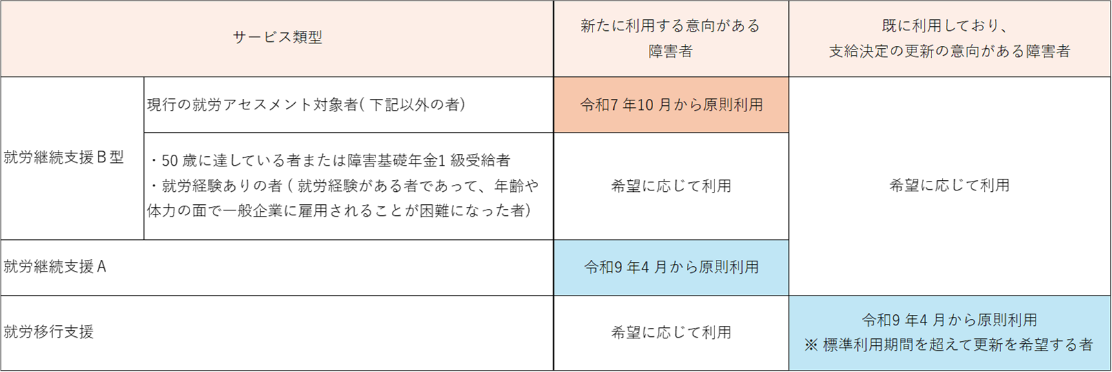 ※50歳に達している者や障害基礎年金1級受給者、就労経験があり年齢や体力の面で一般企業に雇用されることが困難になった者については、就労選択支援によるアセスメントを行うことなく、就労継続支援B型の利用が可能です。詳しくは障害福祉課までお問い合わせください。